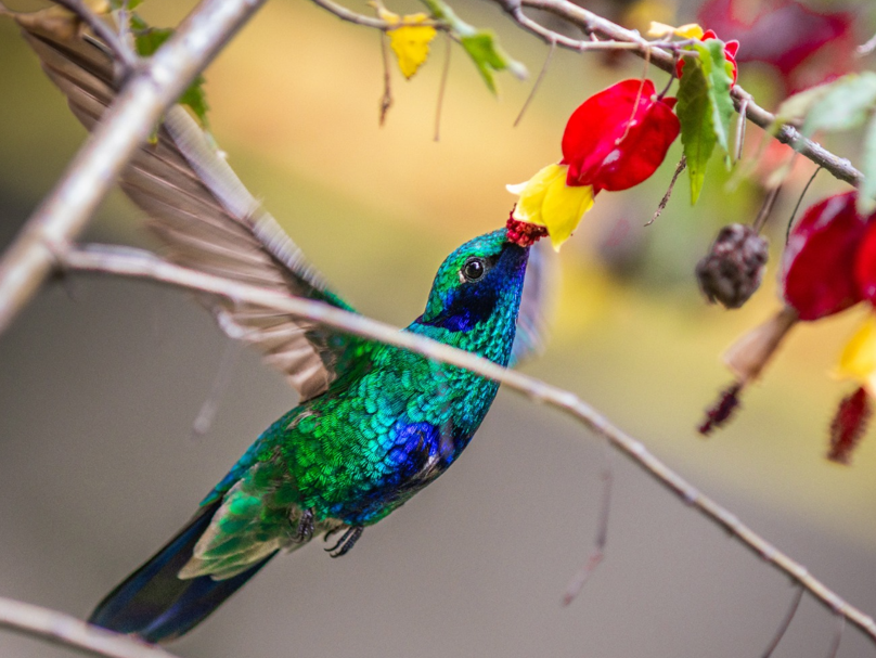• El colibrí chillón, con su colorido plumaje verde y violeta, emite un canto metálico y vibrante que rompe la monotonía del ruido de la ciudad y favorece la polinización.